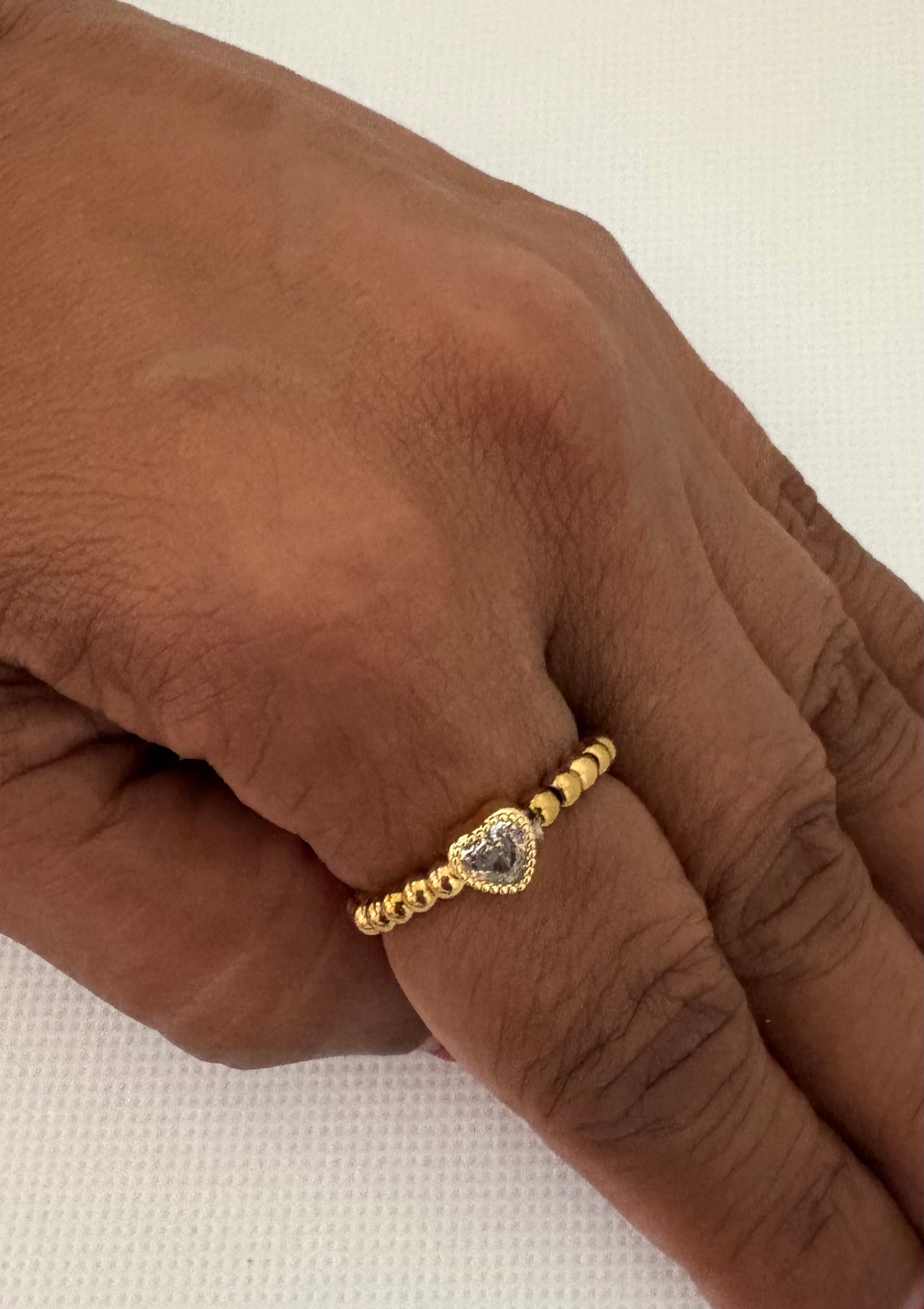 Sortija de elástico con esfera dorada y un corazón diamante, diseñada para añadir un toque de brillo y elegancia a tu estilo diario perfecta para combinar con otras piezas o lucir sola.