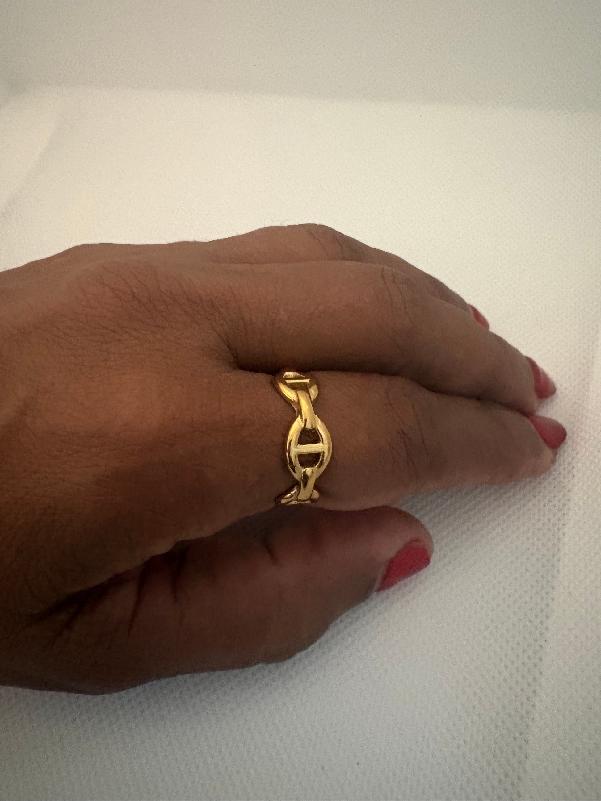 Una sortija elegante con diseño de eslabón que simboliza conexión, estilo y sofisticación.