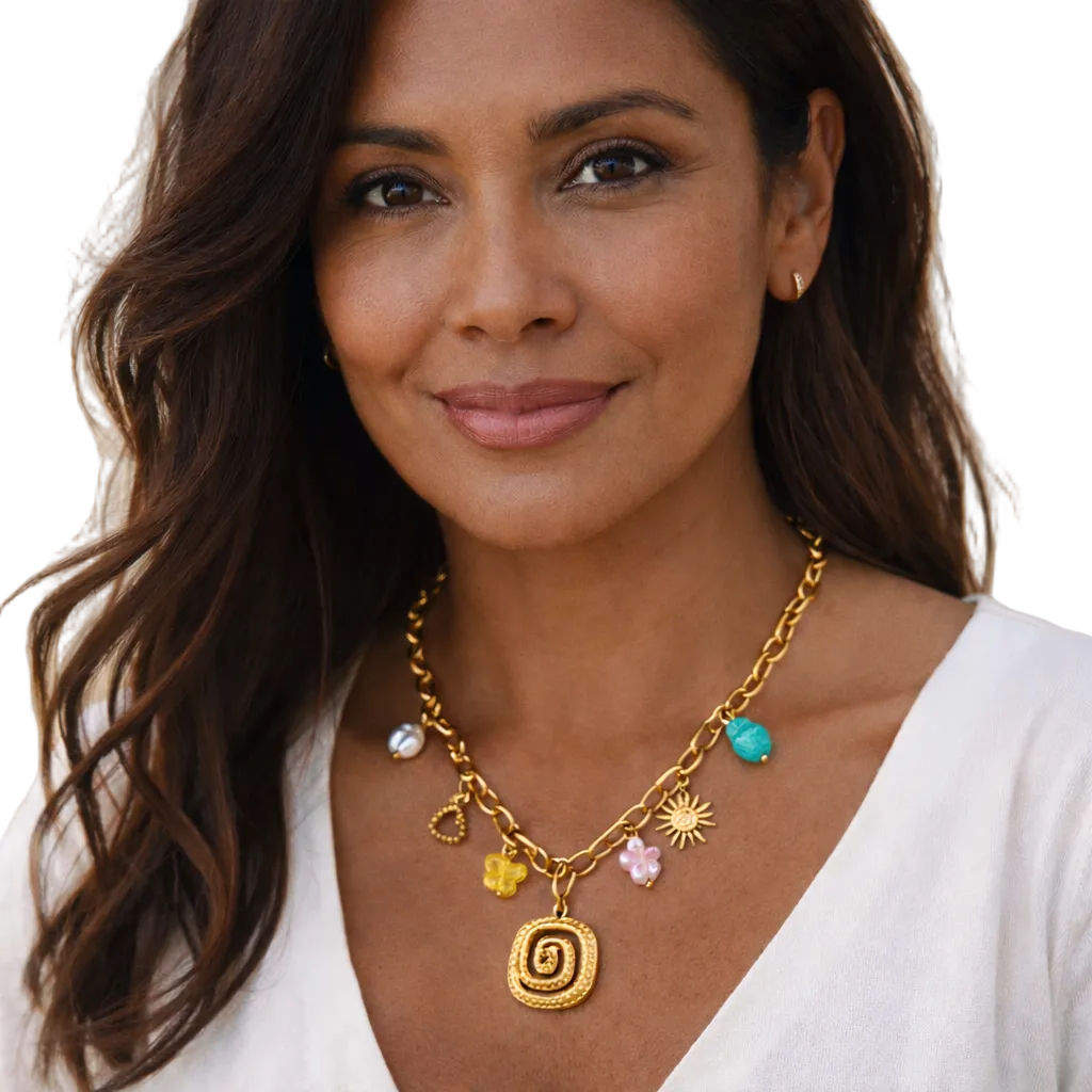 “Alma del Mar y Sol” es un collar dorado que celebra la unión entre la energía cálida del sol y la calma profunda del mar. Sus dijes coloridos y símbolos naturales representan libertad, alegría y conexión con lo divino. Una joya para mujeres que viven con luz y fluyen con el alma. 🌊☀️✨